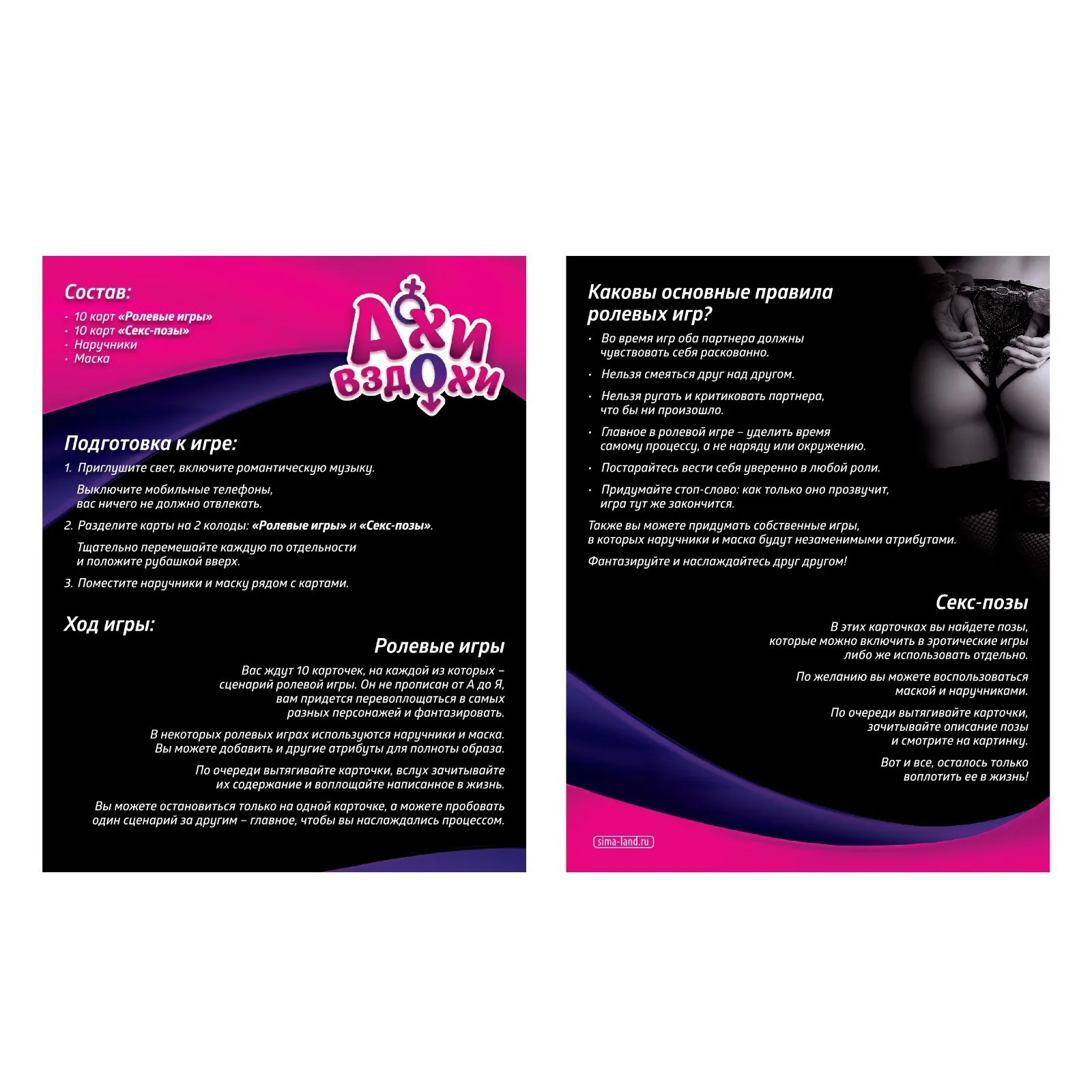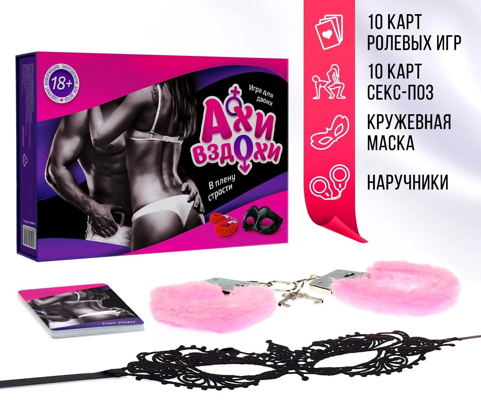 Хотите заново почувствовать тепло любимого человека и испытать эмоции от первой близости? Для этого не нужна машина времени или портал в прошлое. Просто завяжите глаза или станьте героем вымышленного сценария. Чувства обострятся, прикосновения сильнее возбудят, и отношения выйдут на следующий уровень доверия. Отпустите разум, дайте волю желаниям и приготовьтесь наслаждаться вместе с игрой «Ахи-вздохи»!