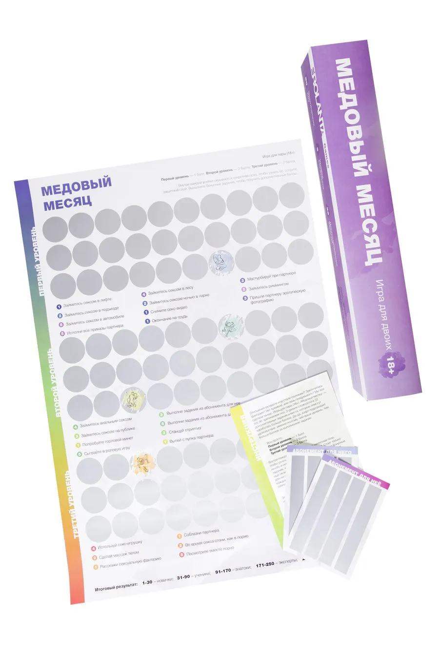 Специальный скретч-плакат содержит 90 эротических поз, 3 уровня сложности и 32 бонусных задания. Выполняйте задания и набирайте максимальное количество баллов, чтобы пройти путь от новичков к профессионалам. Азартная игра позволяет каждому участнику открывать для себя новые грани удовольствий и демонстрировать способности. Игра способна пощекотать нервы, ведь все позы скрыты защитным слоем, а общий результат зависит от вклада каждого участника. Если считаете себя продвинутым игроком, начинайте сразу с третьего уровня. Или продвигайтесь по карте постепенно, создавая свой неповторимый индивидуальный путь.