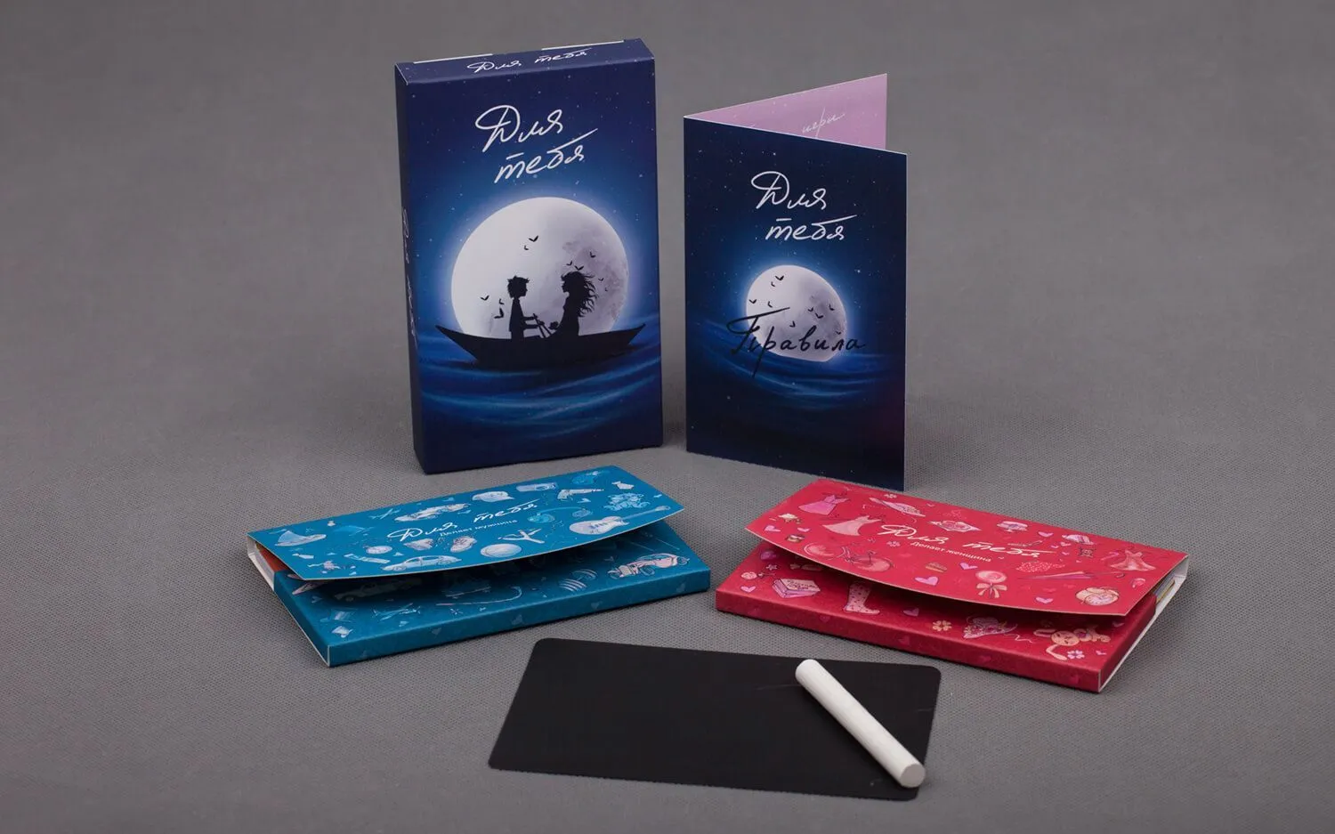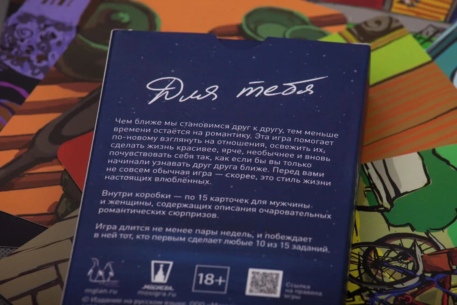В комплекте: 30 карт с заданиями (размер карты 14.5 х 9.1 см), 2 конверта, гибкий магнит на холодильник для ведения счета, круглый мелок, открытка с правилами.