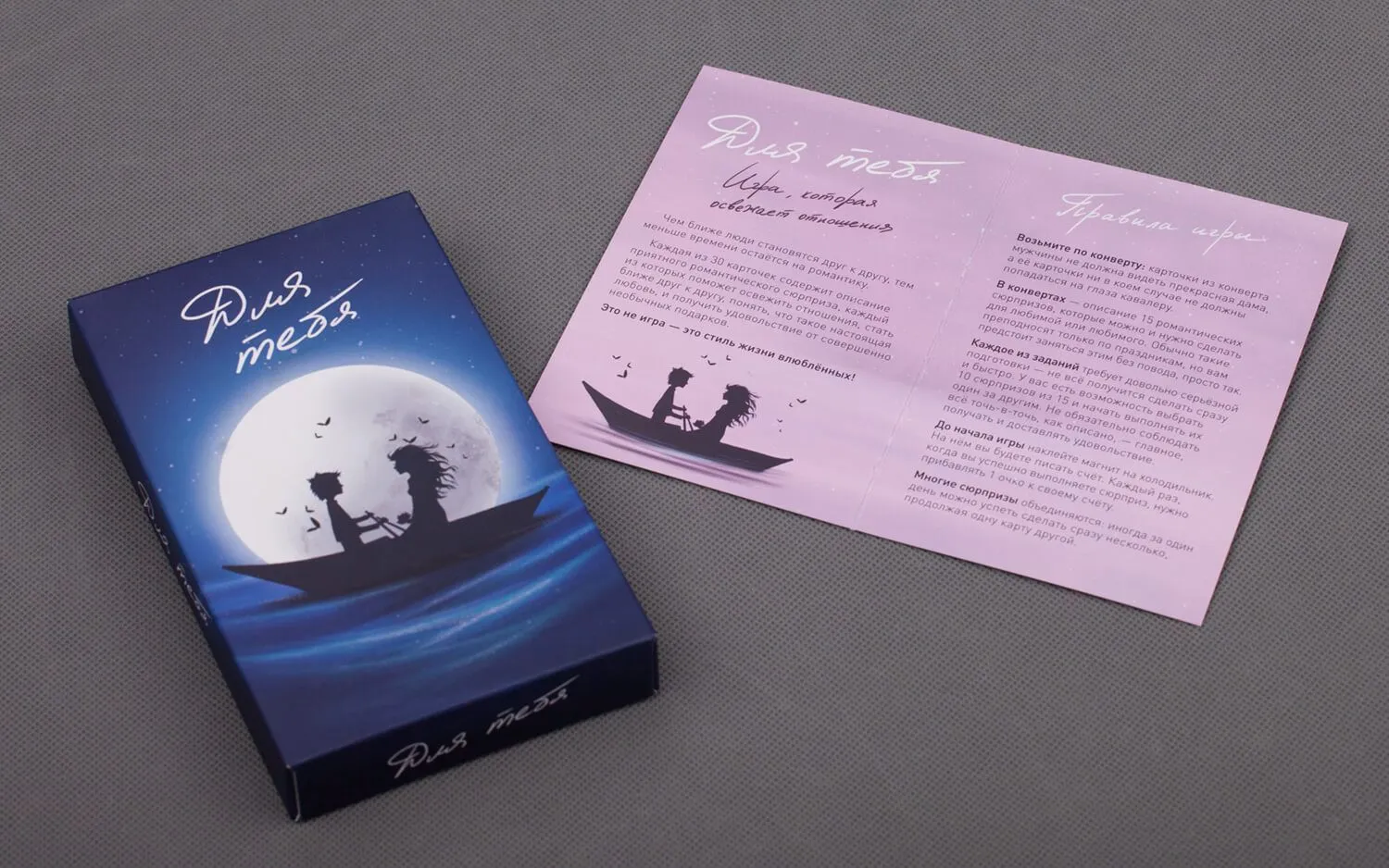 Игра для пары "Для тебя" содержит в себе два запечатанных конверта - одни для него и один для нее. В каждом конверте Вы найдете 15 заданий, которые нужно выполнить для своей второй половинки. Некоторые задания будут требовать от Вас некоторых затрат, но их можно пропускать и возвращаться к ним чуть позже. Побеждает тот, кто первым выполнит 10 заданий. Однако, победа в этой игре не главное, ведь в ее процессе вы подарите друг другу много ярких эмоций и укрепите свои отношения. Игра подойдет как парам, которые уже долго лет вместе и желают снова ощутить радость от первых свиданий, а также молодым парам, желающим добавить в свои отношения романтики.