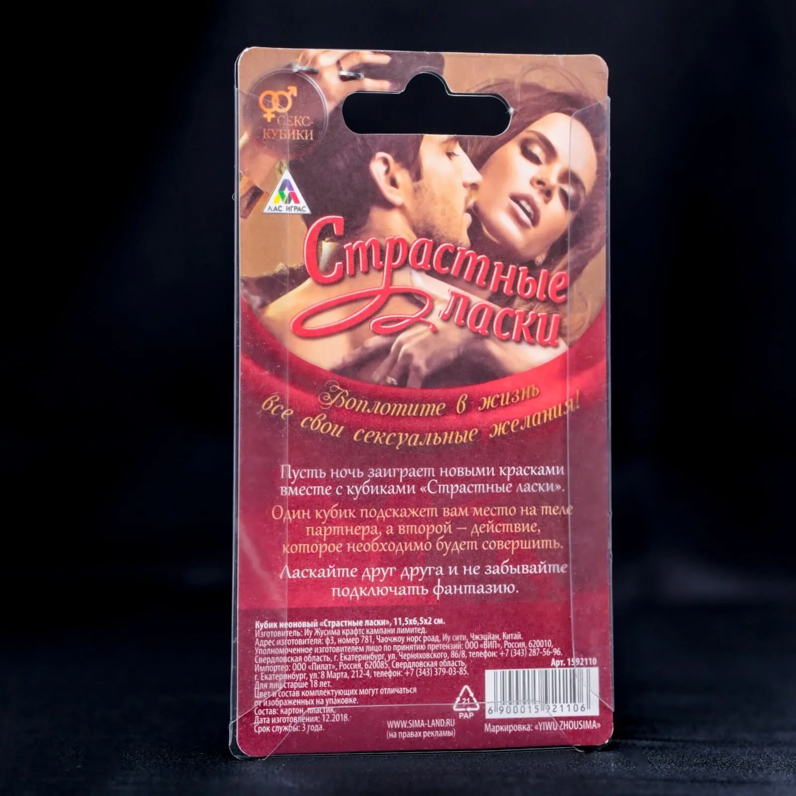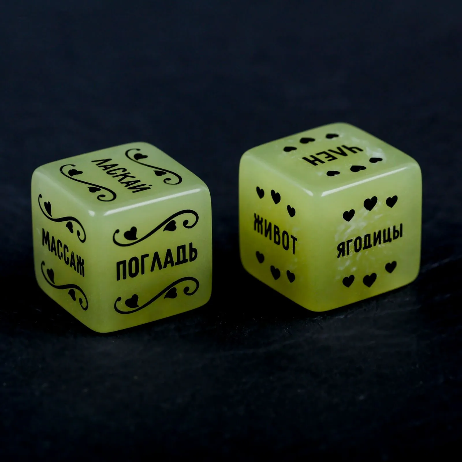 Отдайтесь во власть случая и страсти! В этот вечер неоновые кубики «Страстные ласки» будут диктовать вам правила! А вам остаётся лишь делать то, что на них написано и наслаждаться друг другом и вашей любовной игрой.