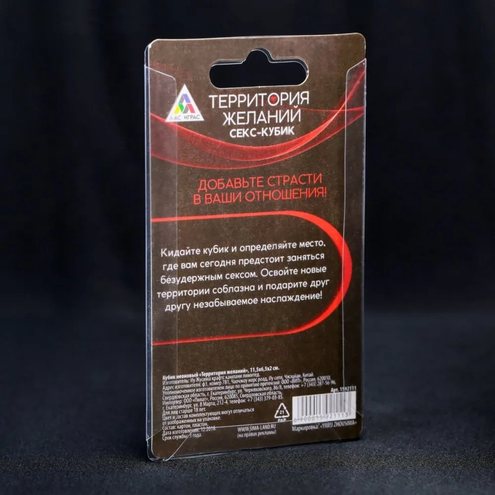 Отдайтесь во власть случая и страсти! В этот вечер неоновые кубики «Где заняться сексом» будут диктовать вам правила! Попробуйте устроить себе волнующее приключение и заняться сексом там, где укажут кубики. Масса впечатлений вам гарантирована.