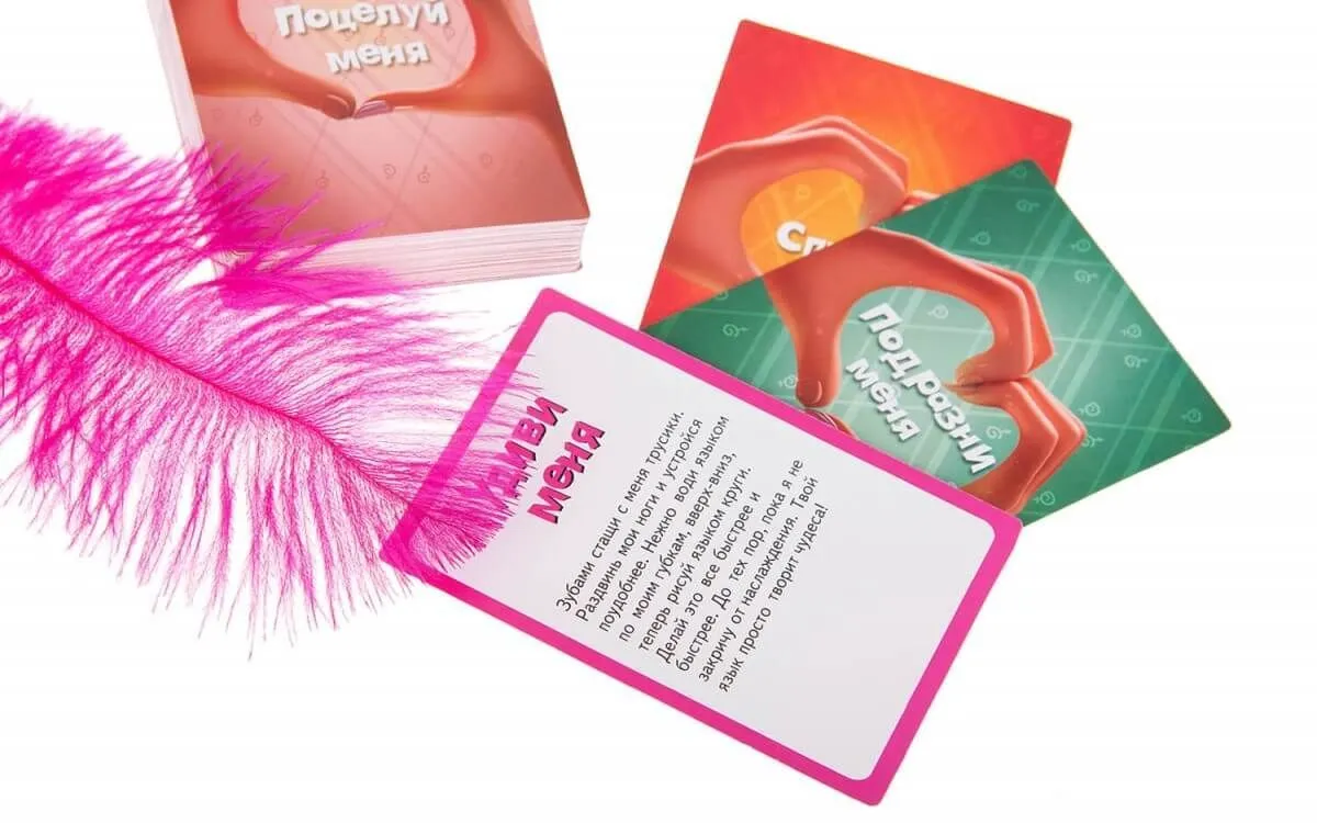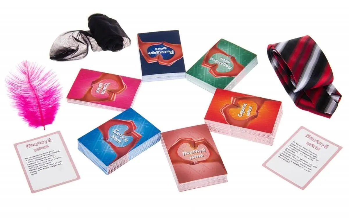 В коробке Вы найдете 240 карт, на каждой из которых написано небольшое интимное задание. При этом задания или вопросы могут быть как вполне невинными, так и очень горячими! В комплект также входят перышко, чулок и галстук, необходимые для выполнения некоторых весьма возбуждающих сценариев игры.