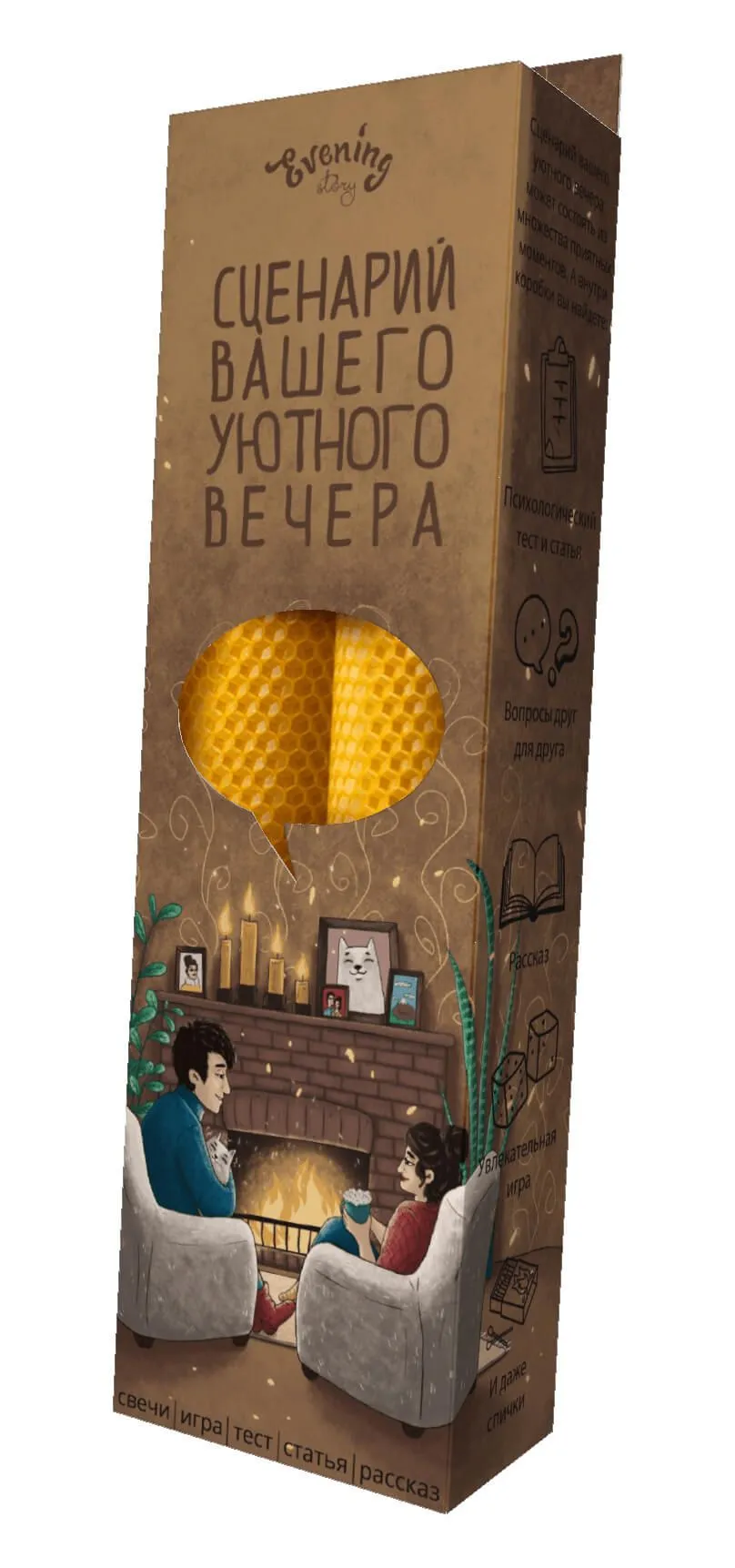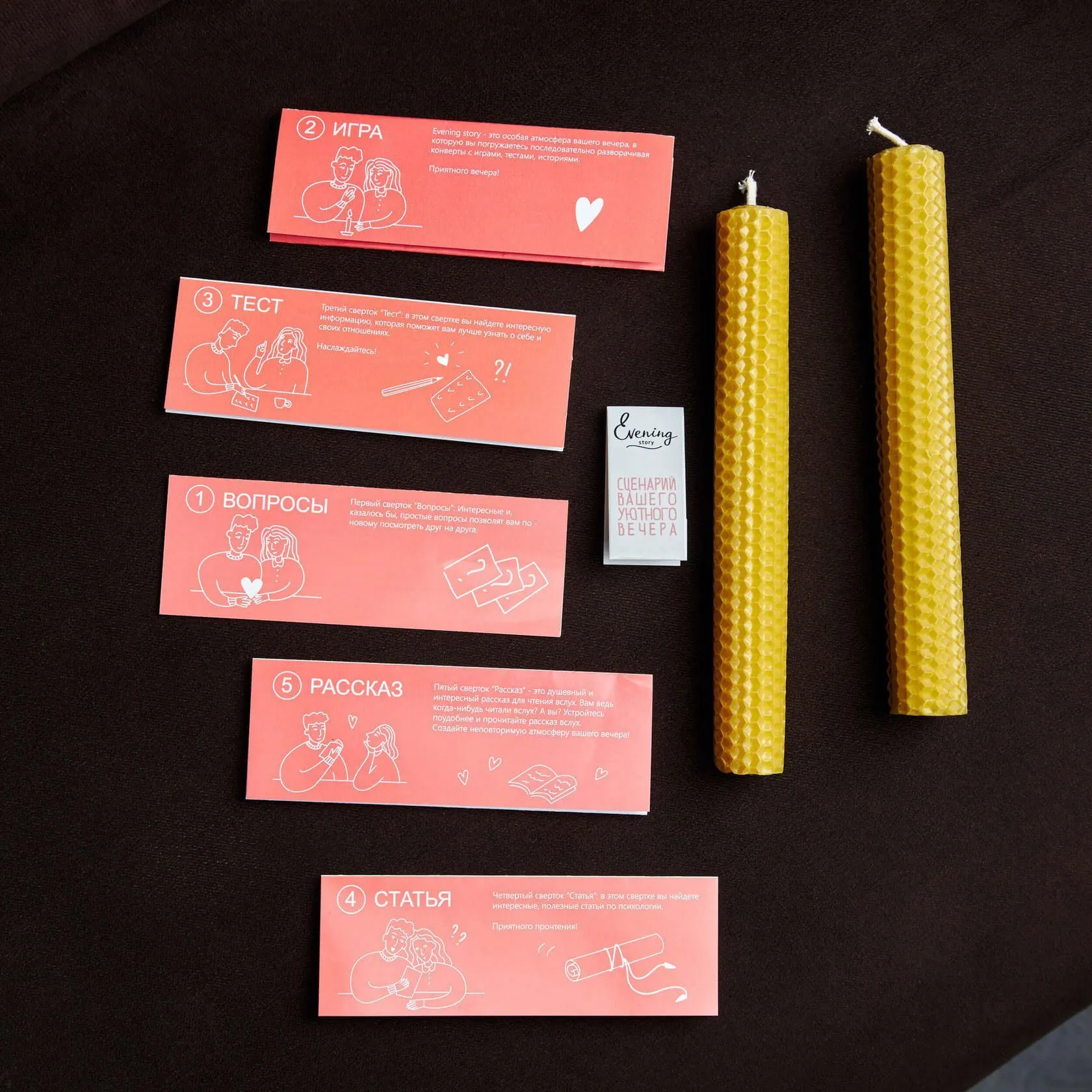 Набор "Сценарий вашего уютного вечера" от Evening Story это легкий способ для пары провести уникальное и запоминающееся свидание. Данный сценарий, за 2 часа, поможет вам сблизится и лучше узнать друг друга. А так же найти в партнёре что-то новое, даже если вам кажется, что вы уже знаете абсолютно всё.
