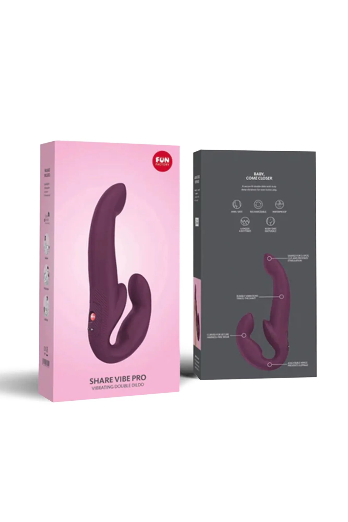 Торжество партнерства и взаимного удовольствия представлено современным поколением безремневых страпонов с вибрацией Share Vibro Pro от немецкого бренда Fun Factory. Идеально сбалансированный безремневой двойной фаллоимитатор Share Vibro Pro представлен в виде конструкции, которая легко удерживается телом, вес страпона 480 г. Анатомический дизайн обеспечивает комфортное и безопасное использование, предотвращая соскальзывание и удерживая головку вертикально во время игры. При вагинальном введении короткий конец игрушки упирается в лобковую кость, что позволяет мышцам промежности легко удерживать игрушку даже без специальных ремней или трусиков! Полная свобода движений и стимуляция обоих партнеров – отличный эксперимент для смены ролей. Рабочая часть Share Vibro Pro имеет анатомическую форму, приближенную к реальному пенису – выраженная головка и упругий кончик, который упирается в зону G. Длина рабочей части 14 см, диаметр 4,1 см. Вторая часть предназначена для ласк активного партнера, длина 11,3 см. Изгиб и выпуклый рельеф удерживает игрушку внутри и соприкасается с двумя эрогенными точками активной партнерши – клитором и точкой «G». Девушка может сама контролировать свой оргазм. Благодаря ограничителю в средней части игрушки использовать страпон можно и для анального проникновения. Удобная форма позволяет контролировать проникновение страпона и легко повторяет движения активного партнера. Share Vibro Pro сближает пары, обеспечивая контакт тела к телу и удовлетворение каждым движением. Двойная стимуляция с помощью короткого вагинального и длинного ствола, прицельно стимулирующего зону G или простату, обеспечивает неповторимые бесконечные ощущения для обоих партнеров. Мощный двигатель распределяет сильные вибрации по всему стимулятору, обеспечивая беспрецедентное удовольствие. Благодаря различным программам оргазма, партнеры могут наслаждаться вместе, достигая кульминации каждый раз. 3 скорости вибрации и 5 режимов оргазма гарантируют настройки под любой вкус, доставляя максимальное удовольствие. Основные преимущества Share Vibro Pro: Близость и удовольствие: Возможность максимально близкого контакта и потрясающих оргазмов от проникновения и вибрации. Мощный двигатель: Глубокие проникающие вибрации распространяются одновременно на обоих партнеров. Материал высокого качества: 100% гипоаллергенный медицинский силикон для безопасности и приятного ощущения. Многообразие программ: 5 уникальных программ оргазма и 3 скорости для разнообразных сексуальных переживаний. Легкий и удобный: Сбалансированный вес 480 грамм и анатомическая конструкция обеспечивают комфорт даже в нестандартных положениях. Длина игрушки 14 и 15 см, диаметр 4,1 см Многофункциональность: Разнообразие позиций и вариантов применения не только с партнером, но и в соло играх. Водонепроницаемость: 100% водонепроницаем. Цвет: Burgundy (Бургундия) Функция блокировки Магнитная USB зарядка Производится в Германии. Гарантия 2 года.