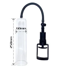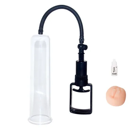 Вакуумная помпа длиной 25 см, выполнена из прозрачного материала. Диаметр колбы – 5,5 см. Воздух откачивается при помощи вакуумного шланга удобным механизмом откачки. Давление в колбе сбрасывается при помощи кнопки, расположенной на верхней части самой колбы. В набор входит вставка для помпы в виде вагины, изготовленной из ТПР