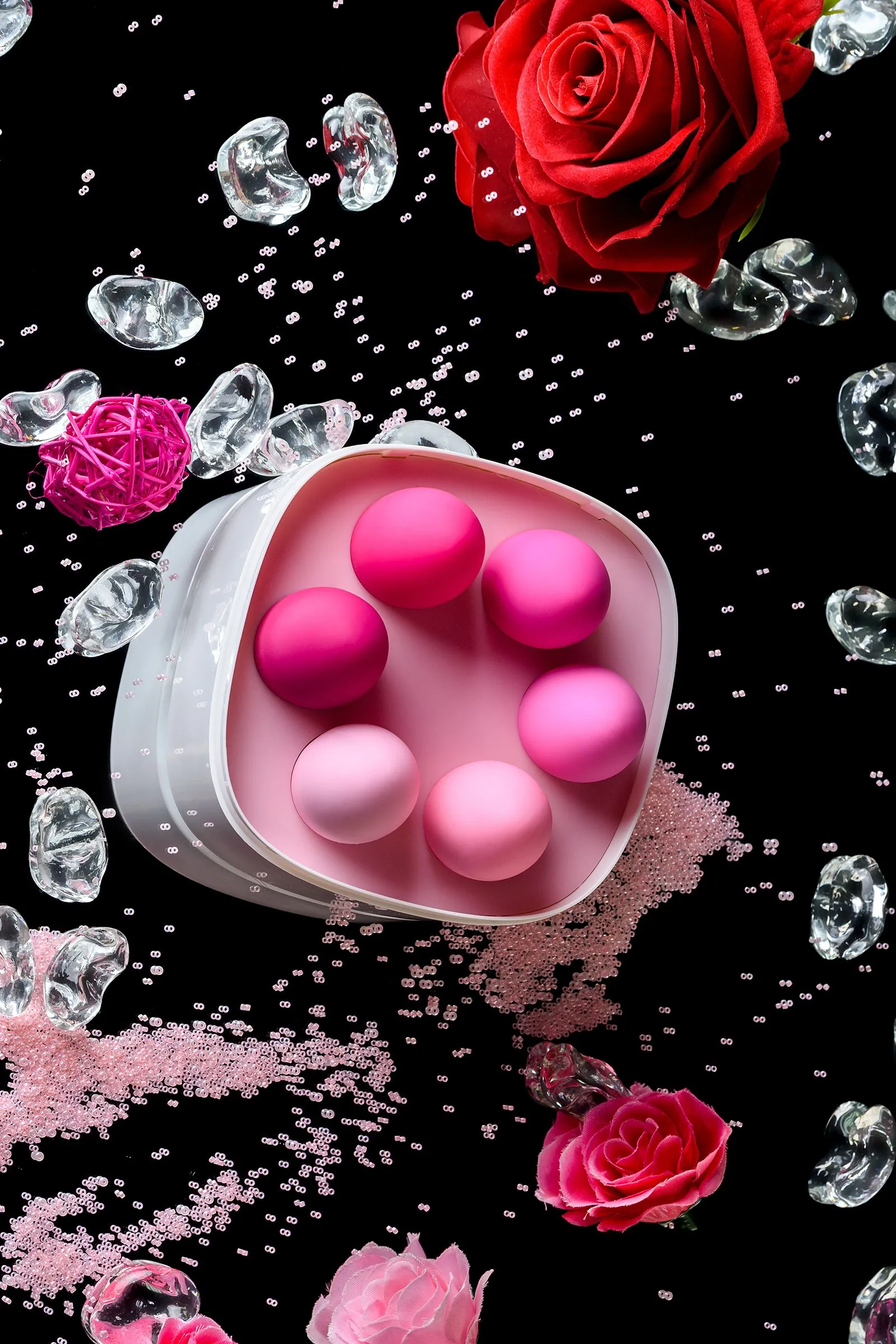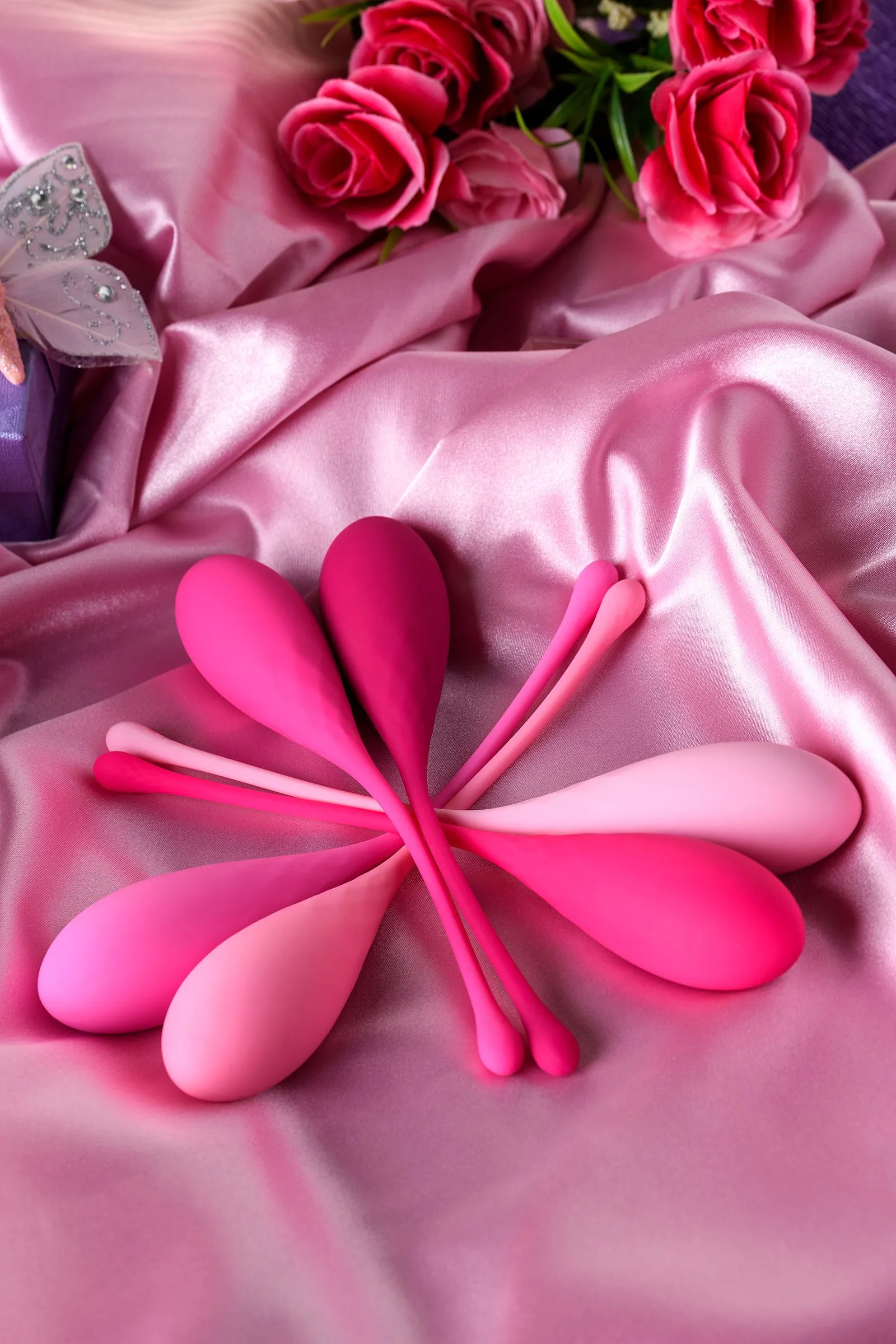 Набор K-Rose превратит гимнастику вагинальных мышц в красивую и эффективную ежедневную заботу о Твоём женском здоровье. Мы уделили тщательное внимание дизайну коробки, чтобы набор было удобно хранить или приятно подарить, поэтому его упаковка отличается особой элегантностью. Мы позаботились о том, чтобы 6 шариков закрыли все Твои потребности в упражнениях с различным весом и Тебе не пришлось докупать новые тренажёры для постепенного увеличения нагрузки в течение года. Выверенный каплевидный дизайн позволит комфортно размещать шарики в теле, а мягкий «хвостик» нежно извлекать по окончании тренировки. Стильная градиентная розовая палитра разрешит Тебе безошибочно определять и использовать необходимый по весу шарик. Занятия интимной гимнастикой с K-Rose помогут укрепить мышцы, избавиться от негативных ощущений во время близости и реальных проблем с женским здоровьем, а также будут поддерживать цветущую сексуальность в любом возрастном периоде. Ты научишься контролировать интимные мышцы и расширишь спектр Твоих чувственных ощущений! В наборе 6 вариантов веса для увеличения нагрузки: 50 г, 65 г, 80 г, 95 г, 110 г, 130 г