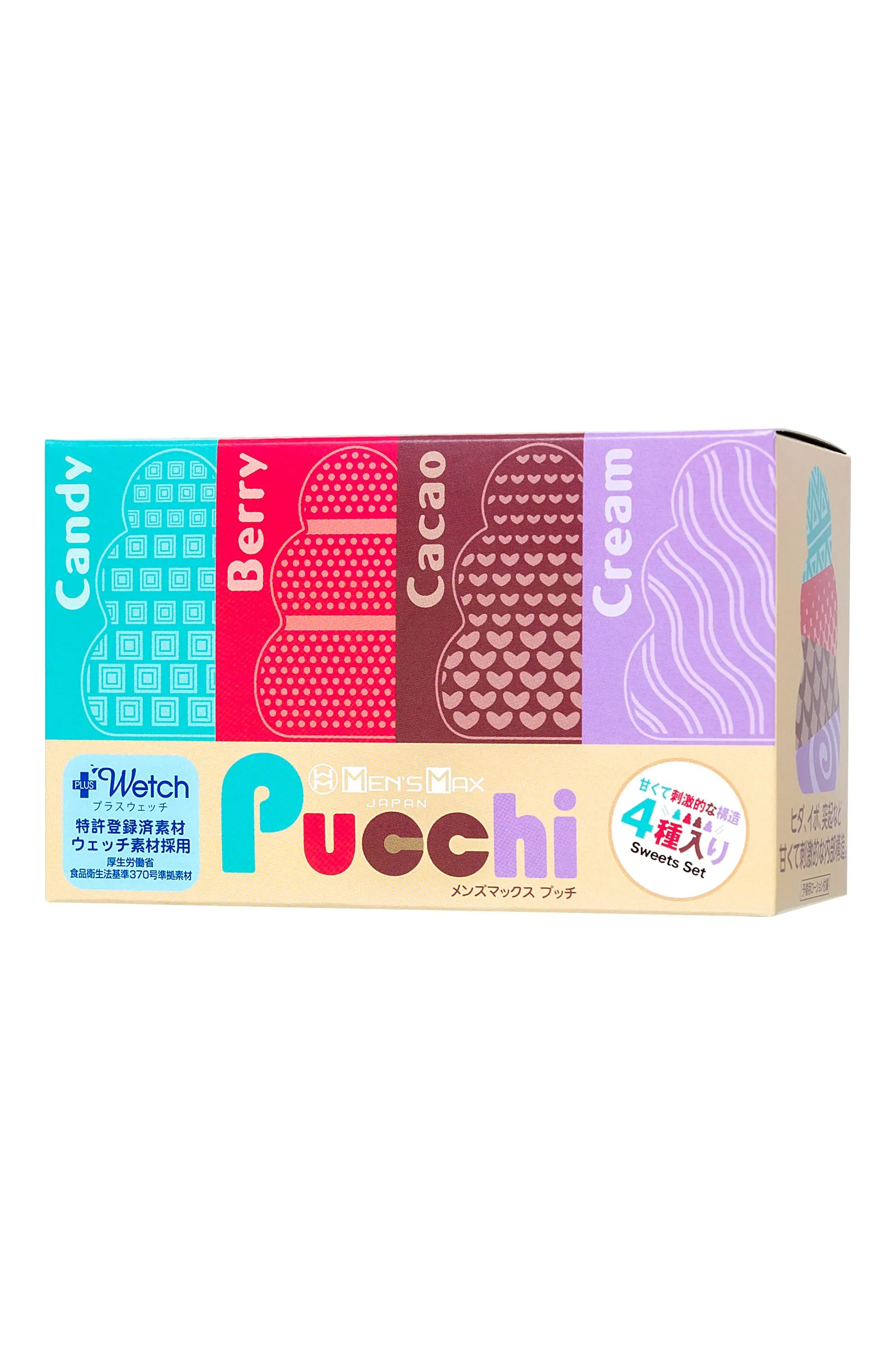 Обновленные карманные мастурбаторы MensMax Pucchi Set Box Sweets в одном наборе. Эти секс-игрушки имеют увеличенный размер, улучшенную эластичность, более четкий рельеф, и выделяют еще больше смазки – берите мастурбатор с собой куда угодно. Все что вам нужно – это MensMax Pucchi и немного воды. Самоувлажняющийся мастурбатор невероятно удобен в командировках, путешествиях и в повседневной жизни. Благодаря запатентованной японской технологии, инновационный материал +Wetch при взаимодействии с водой выделяет густой гель, усиливающий скольжение. Даже во время длительного массажа пениса гель не скатывается и не высыхает. Достаточно добавить немного воды, чтобы испытать полный спектр эмоций от интимного удовольствия. Многоразовая непрозрачная упаковка с замочком-клапаном служит мешочком для хранения. Упругий, но эластичный материал подходит для мужчин с любыми размерами пениса. Материал игрушки тактильно приятный и быстро принимает температуру тела. Чтобы усилить ощущения, добавьте теплую воду и наслаждайтесь температурными играми. MensMax Pucchi производят на новейшем оборудовании в Японии, что гарантирует качество и безопасность использования. В наборе 4 мастурбатора Pucchi с десертными рельефами: Candy, Berry, Cacao и Cream. Каждая игрушка представляет собой мягкую трехъярусную елочку с одним отверстием. Внешняя сторона гладкая и нежная, а внутри разнообразные комбинированные рельефы, которые обеспечивают дополнительный массаж пениса, и особенно ярко ощущаются при стимуляции головки. Чем глубже проникновение, тем ощутимее стимуляция. Когда под рукой целый набор мастурбаторов – легко подобрать нужный рельеф под настроение, или использовать несколько игрушек одновременно. Инструкция: Достаньте мастурбатор из упаковки и налейте в него немного воды (чайную ложку). Старайтесь не намочить внешнюю сторону игрушки, чтобы смазка не мешала вам в процессе. Распределите образовавшийся гель по внутренней поверхности девайса. Начните с массажа головки, так вы сможете получить максимальное наслаждение от рельефа и настроиться на нужный лад. Совершайте вращательные движения по часовой стрелке или против нее. Для предварительных ласк партнерши выверните мастурбатор наизнанку и наденьте на пальцы. После игр промойте Pucchi водой или средством для очистки игрушек. Когда израсходуете смазку мастурбатора, выбирайте лубриканты на водной основе