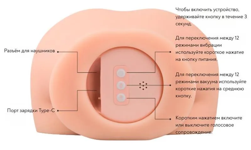Ультрареалистичный мастурбатор, созданный в форме округлых ягодиц, сочетает в себе 12 режимов вибрации, 12 уровней вакуумной стимуляции и звуковую дорожку — это усиливает восприятие и делает использование не только физически, но и эмоционально вовлекающим. Текстурированный внутренний туннель усиливает стимуляцию и обеспечивает эффект, максимально приближённый к реальному. Изделие выполнено из мягкого и приятного на ощупь TPE, не содержащего фталатов, что делает его безопасным для тела и комфортным при контакте с кожей. Мастурбатор прост в управлении: короткими нажатиями можно переключать режимы вибрации и всасывания, а отдельная кнопка активирует звуковую дорожку. Устройство заряжается через порт Type-C, поддерживает подключение наушников и защищено от брызг воды по стандарту IPX5, что упрощает очистку и продлевает срок службы. Размеры: 29×22×24 см, вес — 2700 г.