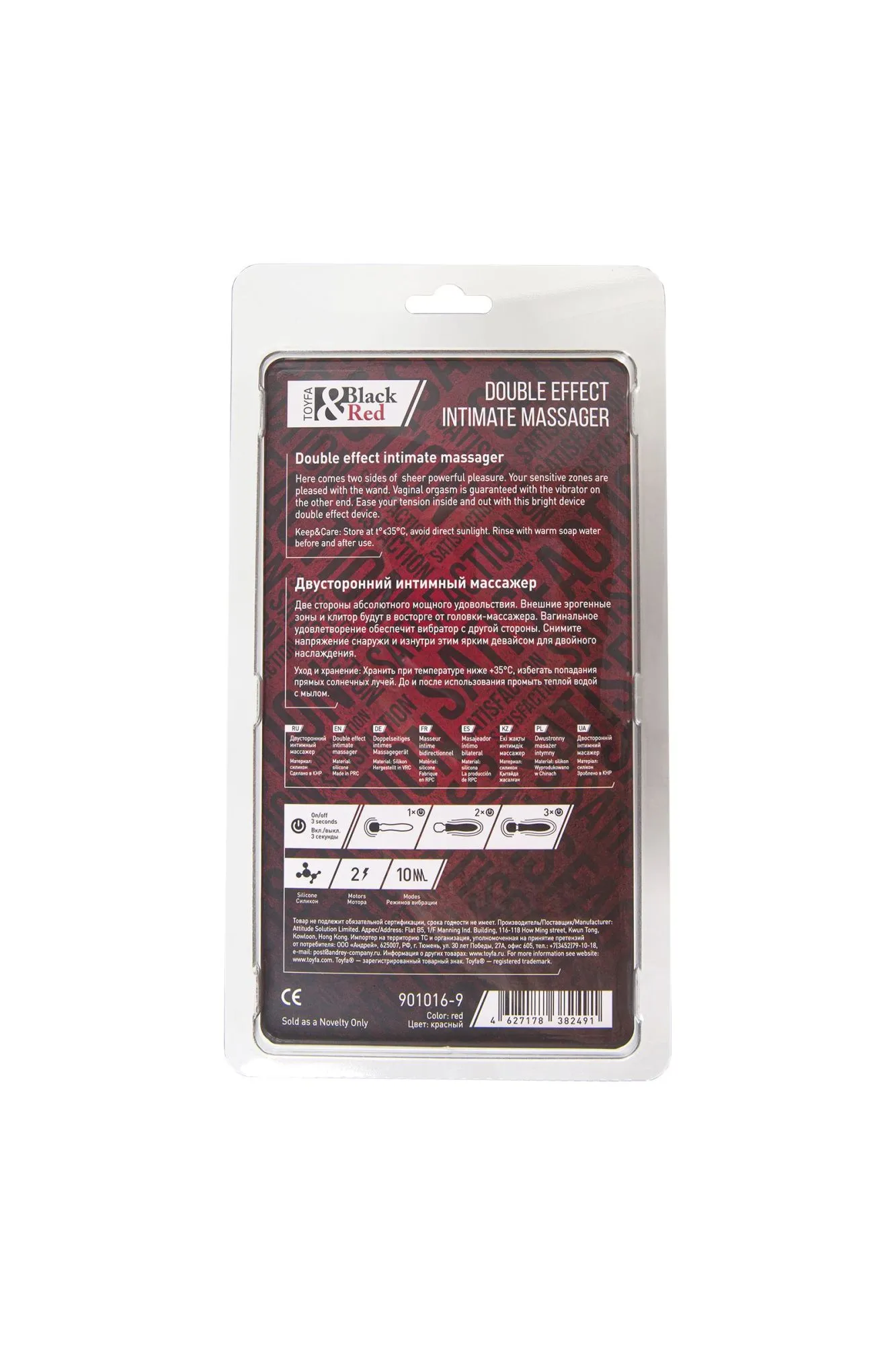 Двусторонний массажер-вибратор из серии Black&Red – ваш “мастхэв” для фантастического удовольствия. Два мощных мотора – в головке и в стволе, могут работать в 10 режимах автономно и одновременно, создавая множество вибрирующих комбинации для новых ощущений. С одной стороны классический массажер-ванд черного цвета. Его головка диаметром 4,3 см легко скользит по внешним эрогенным зонам, снимая напряжение и возбуждая нервные окончания. Используйте для самомассажа, прелюдии, стимуляции клитора, половых губ и других чувствительных участков тела. С другой стороны вибратор яркого красного цвета для вагинального проникновения. Спиральный рельеф погружной части не только украшает ствол, но и дарит дополнительные пикантные ощущения при проникновении. Диаметр ребристой части ствола – 3,2 см, длина рабочей части – 10 см. Легкий и удобный вибромассажер сделан из гладкого и нежного силикона с тактильным silk-покрытием. Для лучшего скольжения добавьте каплю лубриканта на водной основе. Девайс с защитой от брызг IPX6 способен дарить новые впечатления при использовании в душе независимо от вариаций использования. Заряжается с помощью USB-кабеля. Включается и управляется одной кнопкой включения. Последовательность нажатий: 1 - включение, 2 - ванд, 3 - вибратор, 4 - ванд и вибратор. Вторая кнопка переключает режимы вибрации.