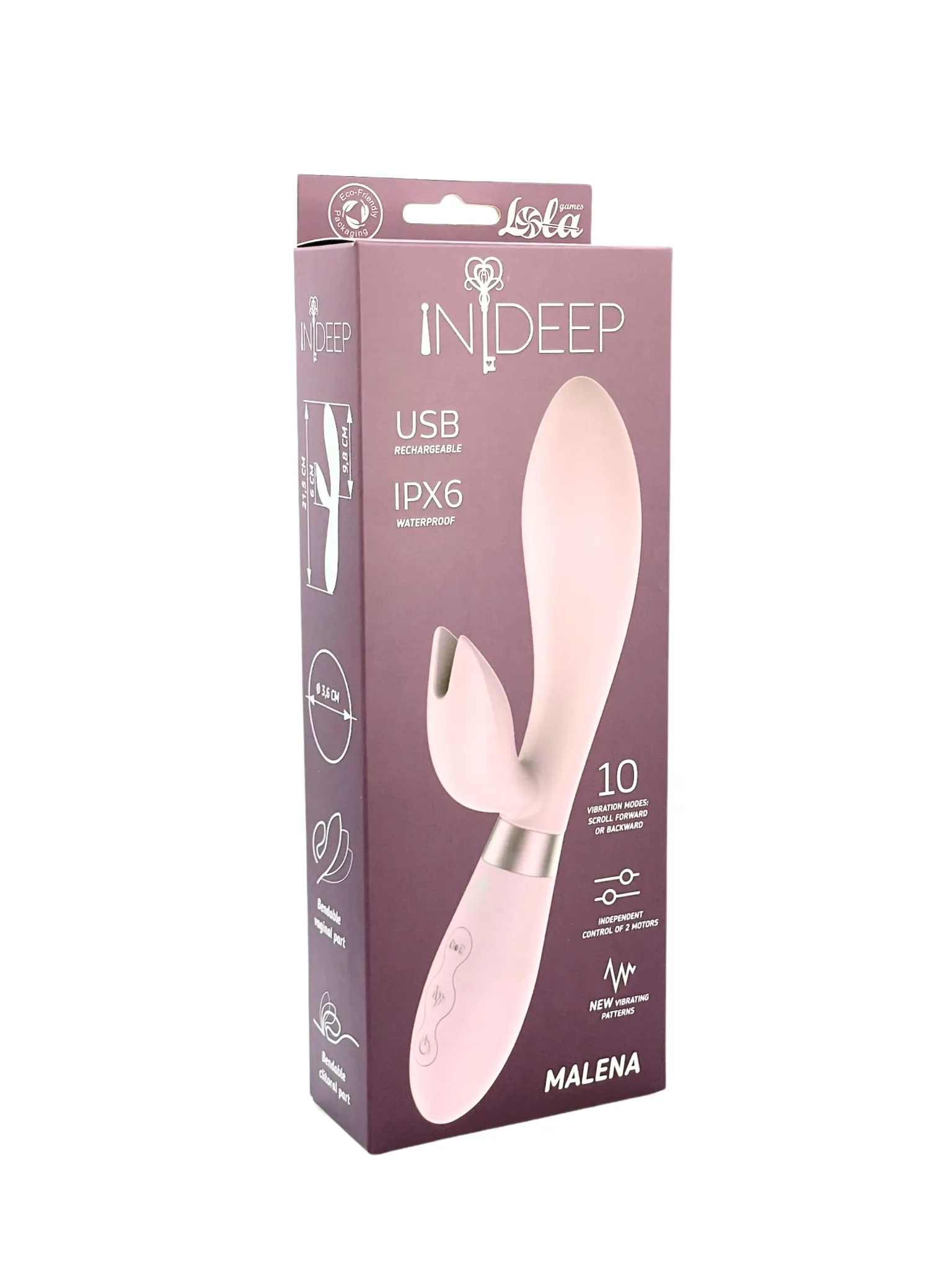 Вибратор Indeep Pro Malena оснащен двумя моторами, которые могут работать как вместе, так и отдельно друг от друга. В каждом из них по 10 уникальных режимов вибрации, продуманных специально для развития вагинального оргазма. Функция отматывания режимов назад позволит легко вернуться назад при необходимости. Гибкость вагинальной и клиторальной частей добавит комфорта в использовании, ведь вибратор будет подстраиваться под изгибы вашего тела. Благодаря стандарту водонепроницаемости IPX6 можно использовать в душе. Заряжается от USB. Изготовлен из гипоаллергенного силикона. Форма клиторального отростка достаточно крупная для того, чтобы подойти каждой женщине вне зависимости от индивидуального анатомического строения. Время зарядки - 90 минут. Время работы - 130 минут. Техника развития вагинального оргазма: стимулируйте клитор снаружи и изнутри одновременно. При приближении оргазма, прекратите внешнюю стимуляцию и сконцентрируйтесь на внутренней. Прекращайте внешнюю стимуляцию клитора каждый раз чуть раньше.
