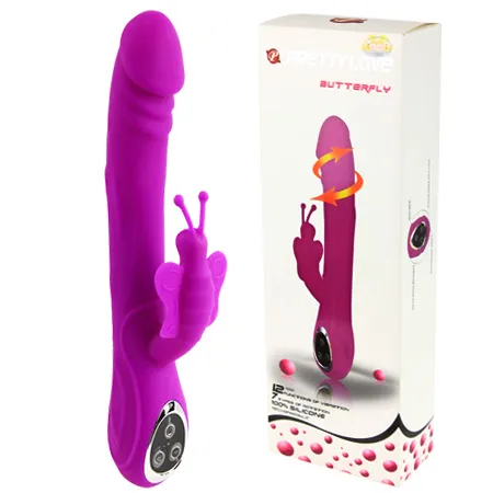 Многоскоростной перезаряжаемый вибратор пурпурного цвета. Имеет клиторальный стимулятор в виде бабочки с усиками. Рельефная поверхность с ярковыраженной головкой. Материал - силикон. Возможно раздельное управление вибрацией основного ствола и отростка. 12 режимов вибрации, 7 режимов ротации (головка может вращаться в обе стороны). Управление производится при помощи сенсорных кнопок у основания игрушки. Общая длина - 25,5 см, рабочая длина - 16,5 см, максимальный диаметр - 4 см, длина клиторального отростка - 9 см, диаметр - 2,5 см (размех крылышек - 5 см). В комплекте зарядное устройство, инструкция на русском языке, мешочек для хранения