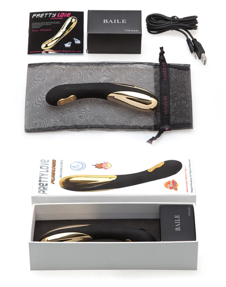 Премиум-вибромассажер черно-золотистого цвета. Выполнен из силикона с металлическими вставками. Имеет функцию нагрева ( нагреваются металлические вставки). Температурный режим - до 45 градусов. 7 режимов вибрации управляются с помощью кнопки, расположеной на ручке игрушки, там же и кнопка управления нагревом. Работает от USB шнура. В комплекте сумочка для хранения. Длина - 16 см, максимальный диаметр - 3 см. Упаковка - картонная коробка.