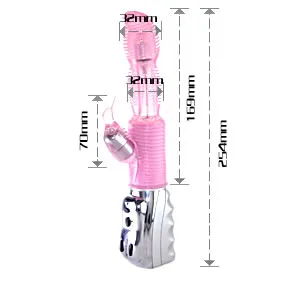 Хай-тек с вращающейся головкой розового цвета с клиторальным и анальным стимуляторами. Имеет 7 режимов вибрациии и 7 режимов вращения. Данные режимы можно совмещать. Мягкий, имеет ребристую рабочую поверхность. Материал изготовления- ТРЕ ( гель). Работает от 4-х батареек типа АА (нет в комплекте). Общая длина 25,5 см, рабочая длина 13 см, максимальный диаметр 3,5 см, длина клиторального стимулятора 5 см, диаметр 2 см, длина анального стимулятора 4 см, диаметр 1 см. Упаковка- прозрачный пластик.