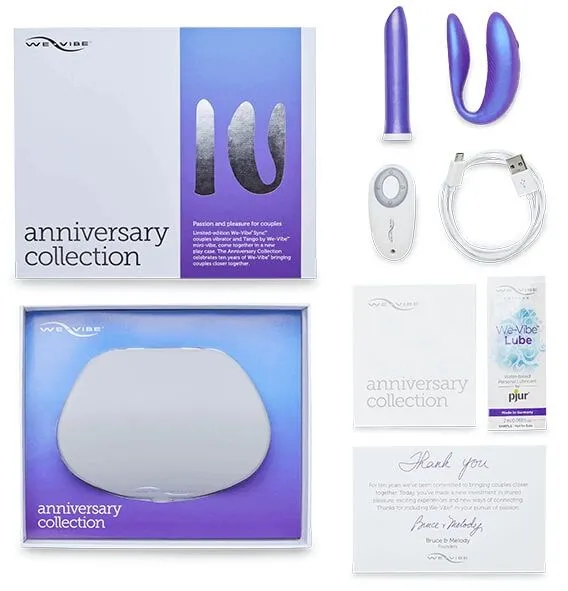 Набор вибраторов Anniversary collection от компании We-Vibe идеально подойдет тем парам, которые хотят разнообразить свою интимную жизнь. В комплект входят вибратор для пар Sync на ДУ, мини-вибратор Tango, а также стильный чехол для хранения, который одновременно с этим служит и базой для зарядки игрушек.
