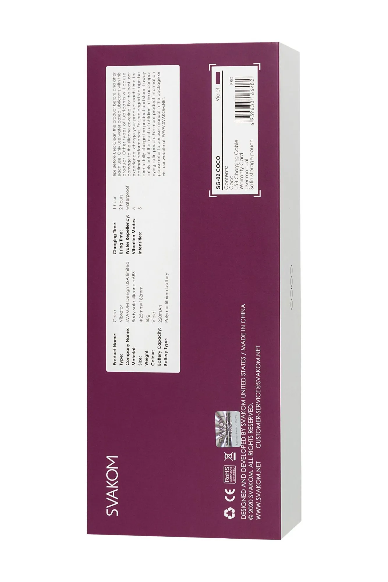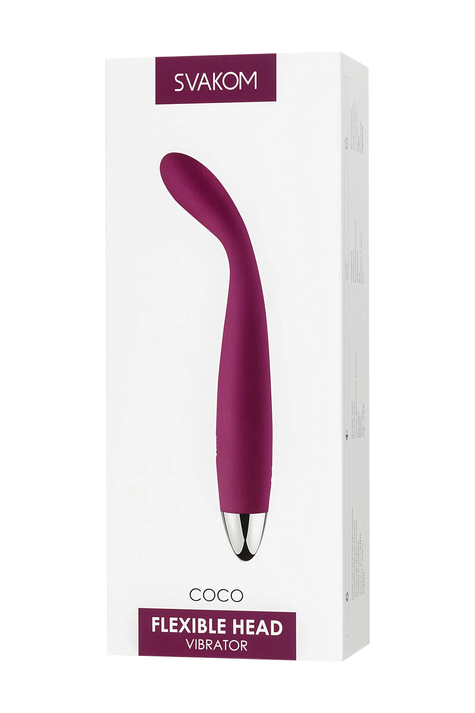 Svakom Coco сочетает в себе уникальные качества, мощный вибромотор для ярких и сочных оргазмов и ультратонкий диаметр ствола вибромассажера. Благодаря этой миниатюрной конструкции вибратор SVAKOM Coco Soft Flexible также может быть введен во влагалище вместе с пенисом. Оба партнера могут чувствовать вибрацию одновременно во время проникновения. Естественная эргономичная форма с изгибом 30 градусов позволяет вибратору SVAKOM Coco идеально проникать во влагалище и стимулировать зону G. Гибкий вибратор SVAKOM Coco Soft может изгибаться от 1 до 180 градусов и достанет до самых тайных эрогенных зон. Гибкий вибратор SVAKOM Coco Soft изготовлен из медицинского силикона, который также используется для изготовления детских сосок, поэтому вибратор полностью безопасен для тела. Coco легко очищать, и его можно использовать в ванной комнате, бассейне, степень влагозащиты IPX7. При использовании трехслойной техники шумоподавления звук мотора SVAKOM Coco составляет менее 50 дБ, что тише, чем такт часов. Вибратор SVAKOM Coco можно полностью зарядить всего за 2 часа и обеспечить около 4 часов непрерывного удовольствия. Все продукты SVAKOM должны быть заряжены с помощью адаптера 5V / 1A (выходное напряжение / ток). Материал: безопасный для тела силикон + ABS Размер: 25мм × 182мм Вес: 60 г Емкость батареи: 400 мАч Тип батареи: полимерная литиевая батарея Время зарядки: 2 часа Используя время: 4 часа Водонепроницаемый Режимы вибрации: 5 Интенсивность: 5