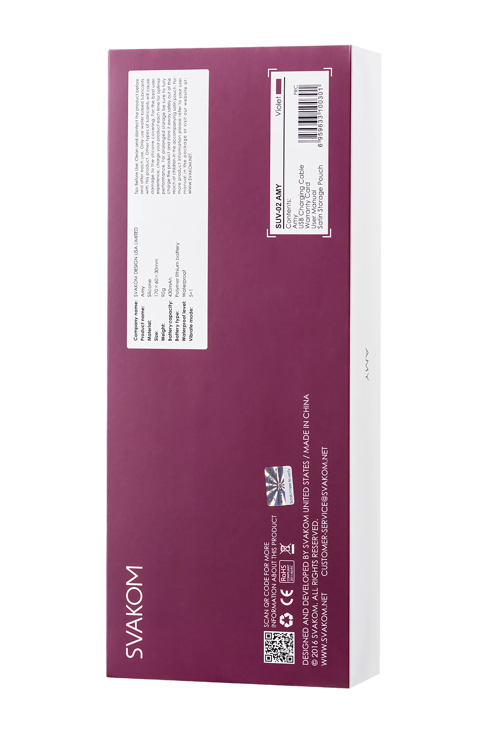 Amy - это влагостойкий массажер анатомической формы. Благодаря новшествам, которые ввела компания Svakom, Amy становится лучшим выбором для тех, кому важна безопасность, удобство и эффективность их секс-игрушек. Благодаря своей форме он фокусируется на самых чувствительных зонах женского тела. Элегантный, средних размеров вибратор со стимулятором для точки G приятен не только на взгляд, но и на ощупь. Amy не содержит фталатов и абсолютно гипоаллергенна. Конструкция позволяет использовать игрушку в душе. Amy имеет 6 режимов работы, которыми можно легко управлять с помощью одного прикосновения. Время зарядки - 1,5 часа. Время длительного использования - 3 часа