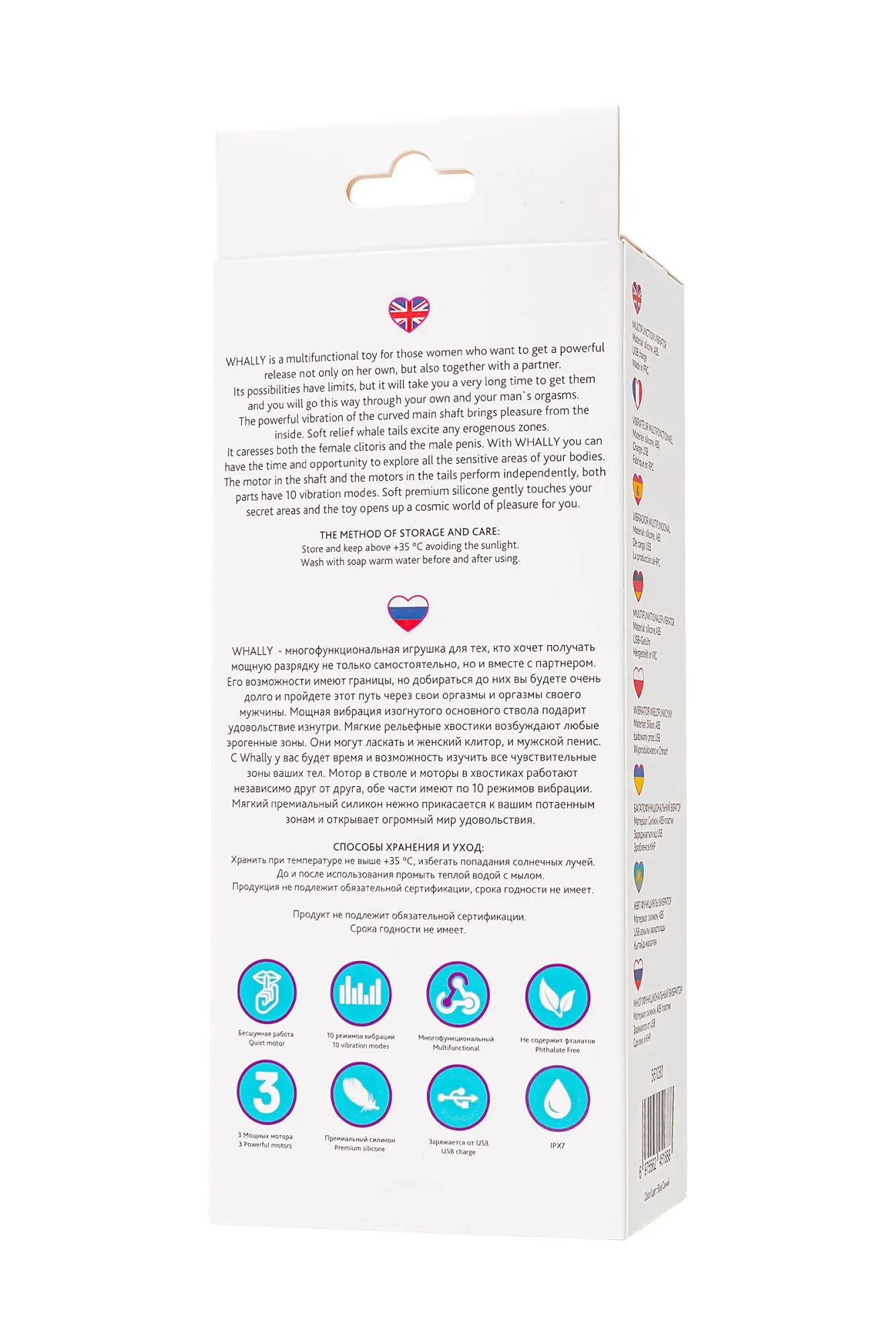 WHALLY от бренда L`Eroina – это идеальный выбор для тех, кто ищет многофункциональную игрушку, способную доставить максимальное удовольствие как самостоятельно, так и с партнером. WHALLY - это парная игрушка с безграничными возможностями, которые вы будете исследовать на протяжении долгого времени, наслаждаясь каждым мгновением. Основной ствол с изогнутой формой и мощной вибрацией позволяет наслаждаться сильными ощущениями изнутри. Особый изгиб отлично стимулирует зону G. А мягкие рельефные хвостики на другом конце и их регулируемые скорости позволяют ласкать любые эрогенные зоны – от клитора до пениса. Игрушка может использоваться для анальных ласк, для этого не забудьте воспользоваться презервативом. 3 мощных мотора – в стволе и хвостиках работают независимо друг от друга, предлагая вам по 10 разных режимов вибрации в каждой части, которые вы можете настроить на свой вкус. Только представьте какие оргазмы вам предстоит испытать, прежде чем функционал игрушки будет изучен полностью. WHALLY изготовлен из мягкого премиального силикона, который нежно касается вашей кожи, придавая особую чувственность и комфорт. Шелковистое бесшовное покрытие из силикона делает использование игрушки не только гигиенически безопасным, но и тактильно приятным. Для большего комфорта воспользуйтесь лубрикантом на водной основе. Используйте его соло или с партнером, чтобы наслаждаться мощными оргазмами. Чтобы испытать весь спектр удовольствия, возьмите игрушку с собой в душ, ванну и бассейн. Водонепроницаемость уровня IPX7 позволяет получать удовольствие в воде до 30 минут. WHALLY от L`Eroina – это игрушка, которая поможет вам раскрыть свои потаенные зоны и дать вам мир безграничного удовольствия. Материал - силикон, цвет - ярко-голубой 10 режимов вибрации 3 мощных и бесшумных мотора Общая длина 18,5 см, рабочая длина 12,5 см, диаметр вибратора 3,5 см Длина хвостиков 8 см, диаметр хвостиков 1,3 см Водонепроницаемость - IPX7 Магнитная USB-зарядка (кабель в комплекте) Время зарядки - 3 часа Время использования до 60 минут