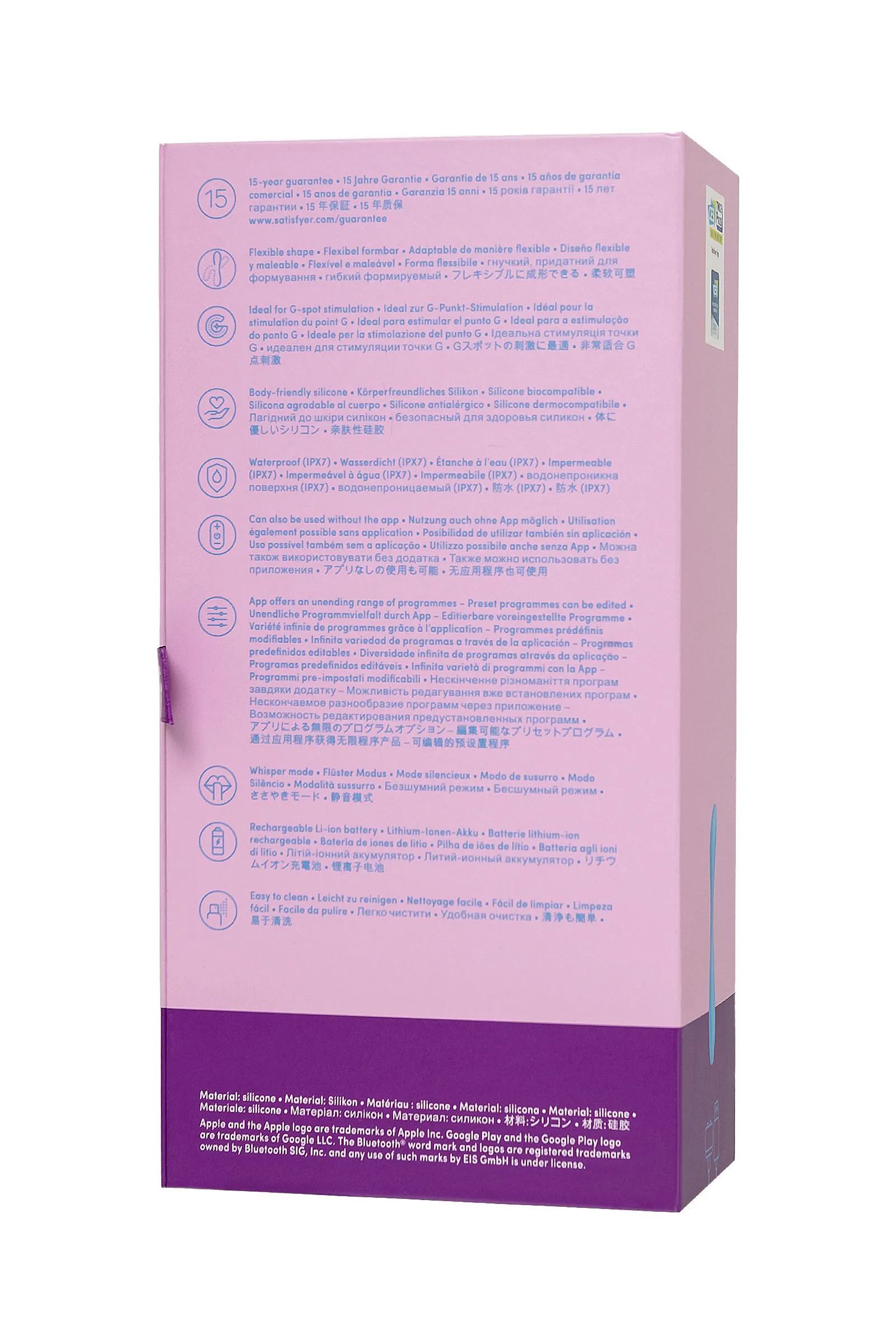 Мультифункциональный и супер гибкий вибратор G-Spot Flex 4 от Satisfyer нацелен на стимуляцию самых чувствительных и потайных эрогенных зон. G-Spot Flex 4 имеет полностью гибкую шейку. Регулируемый угол стимуляции позволяет зафиксировать вибратор так, чтобы зона G получила максимальное соприкосновение с вибрирующим наконечником. G-Spot Flex 4 в сочетании с фантазией проведет вас по пути неземного блаженства в сольной игре или прелюдии с партнером. Воспользуйтесь гибкостью игрушки, чтобы получить одновременную стимуляцию зоны G и клитора. Элегантный дизайн идеально разработан для воздействия на точку G – для интенсивной стимуляции и комфортного расположения в руке. Деликатное воздействие на все известные и еще неизвестные эрогенные зоны обеспечивает упругая продолговатая форма ствола. Изящный кончик точно ласкает область зоны G и подходит для стимуляции внешних эрогенных зон. Интуитивно понятное управление тремя кнопками прямо на корпусе игрушки. Мощный надежный мотор стимулирует наслаждение с помощью 12 предустановленных паттернов вибрации. Испытайте удовольствие по-настоящему с бесплатной функцией управление при помощи смартфона с поддержкой Bluetooth через приложение Satisfyer Connect, доступное на Android и iOS. Создавайте собственные уникальные режимы вибрации, существенно расширив возможности предустановленных режимов. Девайс способен вибрировать даже в такт музыке. Satisfyer Connect не имеет границ – передавайте управление удовольствием партнеру даже на большом расстоянии. Шелковистое силиконовое покрытие — фирменный знак Satisfyer, тактильно нежный и приятный на ощупь. G-Spot Flex 4 позаботится о самых чувственных прикосновениях даже в ванной и душе. Благодаря водонепроницаемости IPX7 игрушку можно погружать под воду до 30 минут. Чтобы получить максимум удовольствия и сохранить материал в наилучшем виде, рекомендуется пользоваться качественной смазкой на водной основе. После использования обязательно очищайте стимулятор теплой водой со специальными бактерицидными спреями для интимных товаров. Особенности: Анатомически совершенный – регулируемый угол стимуляции зоны G, клитора и других эрогенных зон. Простое управление тремя кнопками. Возможность подключения приложения Satisfyer Connect. 12 режимов вибрации. Нежный голубой цвет и мягкий, эластичный силикон без запаха, без аллергенов и вредных для здоровья веществ. 100% водонепроницаемый - IPX7. Перезаряжаемый, магнитный USB-кабель. 15 лет гарантии от производителя.