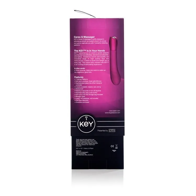 Key Ceres G Spot сделан из качественного силикона и очень приятен на ощупь благодаря своей бархатистой текстуре. Он не обладает запахом и полностью гипоаллергенен. Работает от двух батареек типа АА (в комплект не входят).
