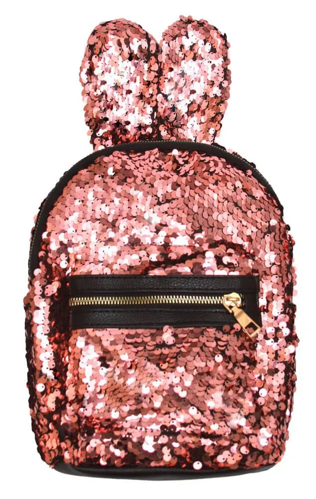 Этот яркий и стильный рюкзачок розового цвета выполнен из искусственной кожи и украшен переливающимися на свету пайетками и милыми крольчьими ушками. Он будет служить Вам как удобный аксессуар для переноса небольших вещей, а также удачно дополнит Ваш образ. Такой рюкзачок незаменим в путешествиях, ведь в него отлично поместятся все важные вещи - документы, телефон, деньги, ключи. Также его можно взять с собой на вечеринку или какой-либо фестиваль.