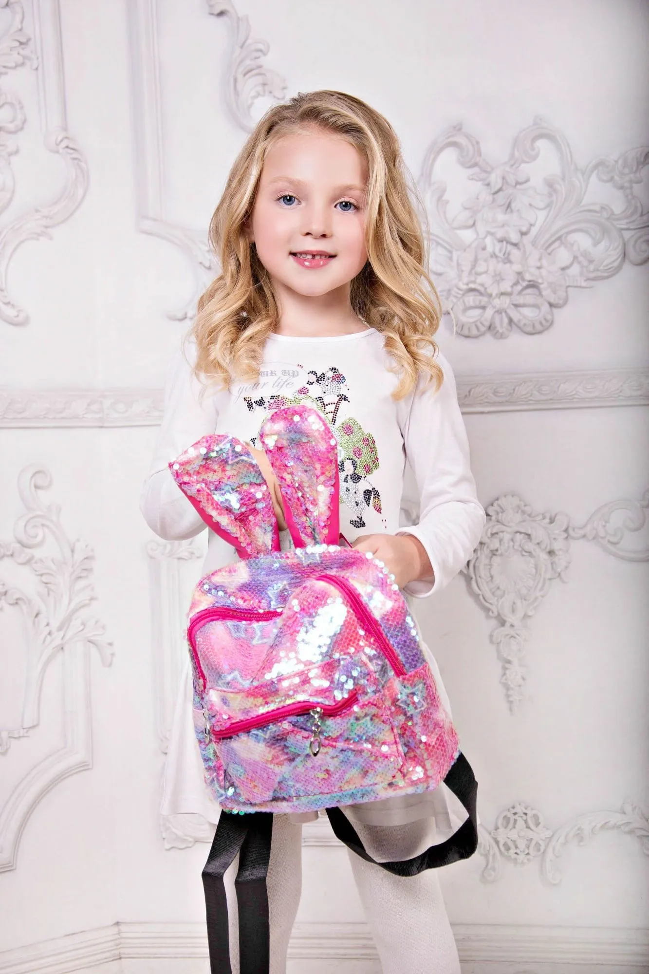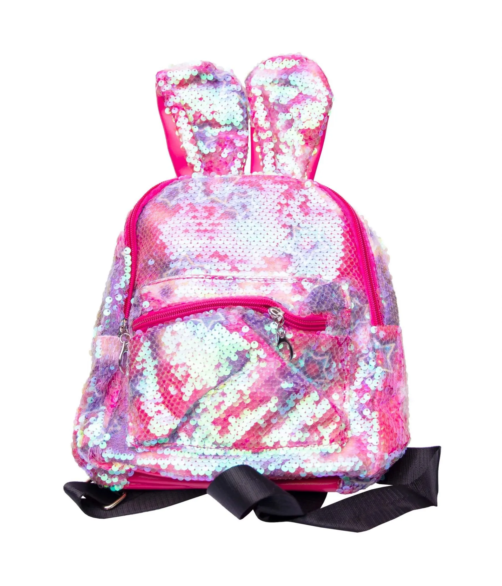 Очаровательный розово-фиолетовый рюкзак с ушками, усыпанный переливающимися пайетками.