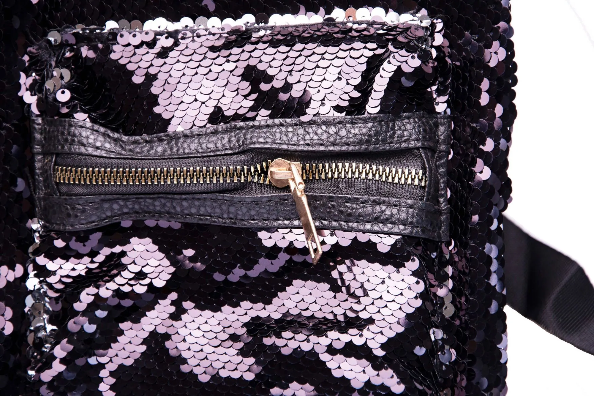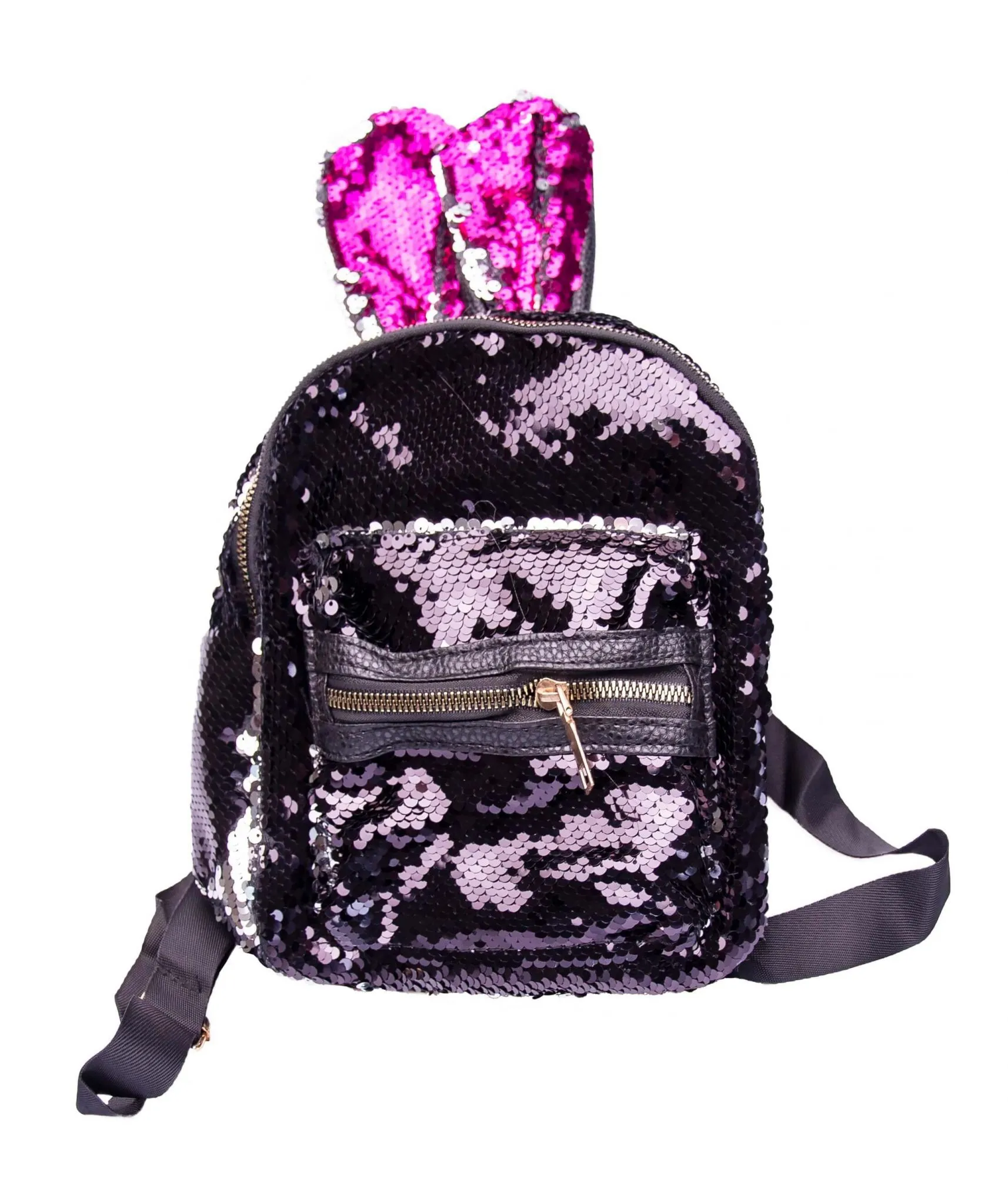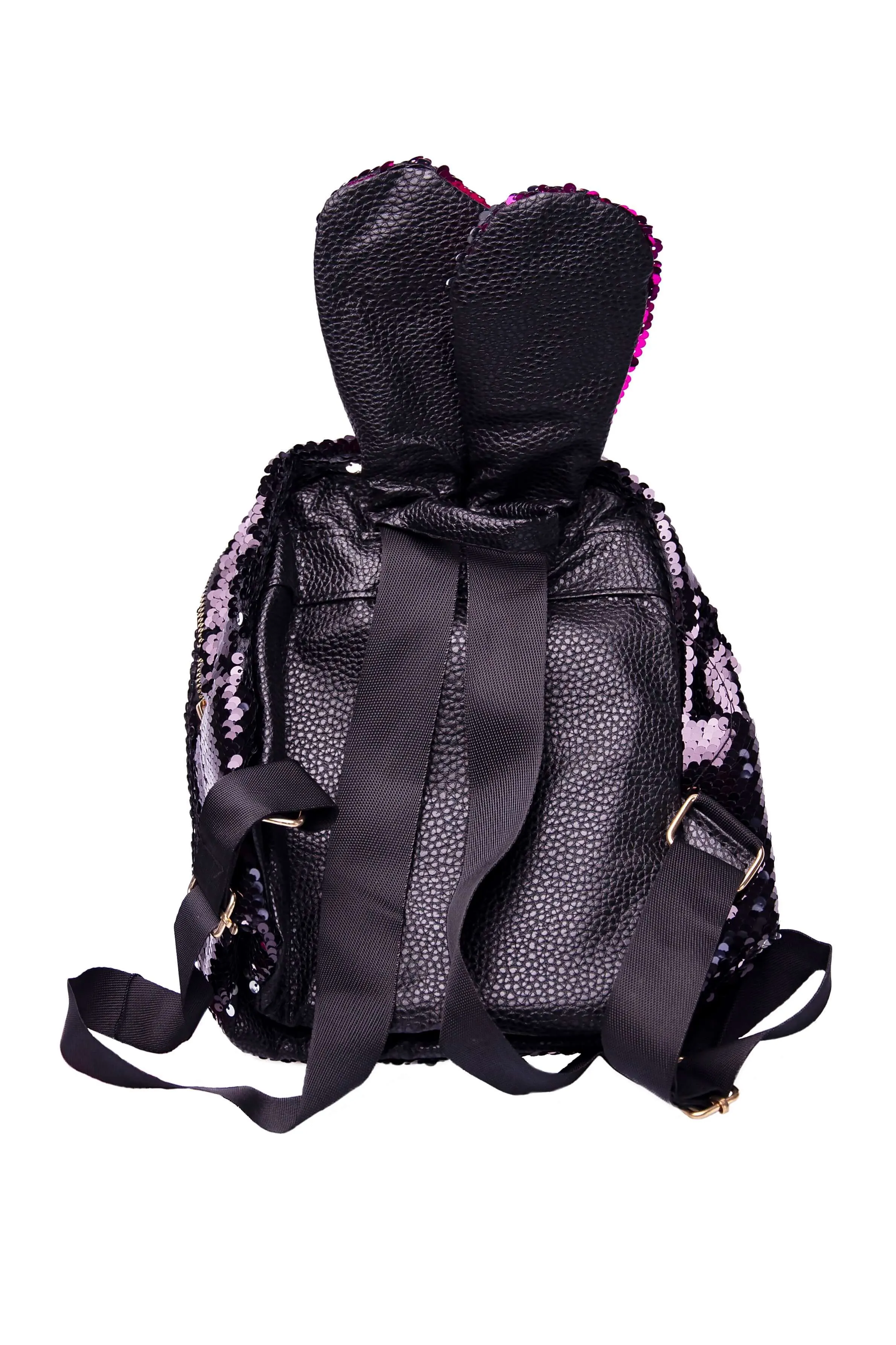 Очаровательный чёрный рюкзак с розовыми ушками, усыпанный переливающимися пайетками.